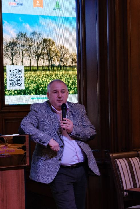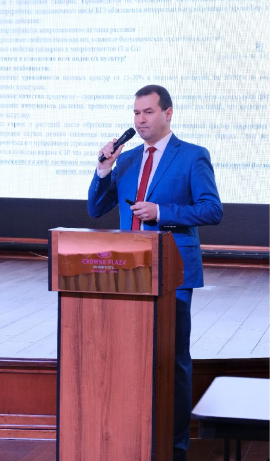 Следующим спикером выступил коммерческий директор ООО «РостАгроИмпэкс» Попов Сергей Николаевич с докладом на тему: «Листовые подкормки и гербициды органического происхождения». Сергей Николаевич подробно рассказал о продуктах, производимых компанией. Это органические удобрения на основе технологии переработки подсолнечного масла и средства защиты растений от сорняков и болезней.