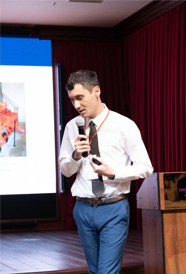 Завершающим докладом в первый день конференции был доклад на тему «Обзор технических особенностей сеялок прямого посева» Николая Викторовича Сухинина, главного конструктора ООО «Аграрум-техника». Николай Викторович рассказал об истории появления «ноутильных» сеялок, какие бывают навески сошника грядиля (маятниковая и параллелограммная), их преимущества и недостатки. Подробно описал виды сошников, в чем преимущества и недостатки каждого. Какие существуют механизмы регулировки давления на сошник, какое огромное множество существует разновидностей прикатных колес, а также в чем отличие между косозубой и прямозубой катушкой в высевающем аппарате. Николай Викторович в своём выступлении поделился с участниками собственным опытом разработок и исследований. Также рассказал об особенностях устройства сеялок модельного ряда «VITON». На какие исследования ученых в сфере почвоведения и растениеводства опирались во время принятия конструктивных решений в компании «Аграрум-техника». Сеялки VITON имеют двухдисковый дифазный сошник на маятниковой подвеске, высевающие аппараты с косозубой катушкой. Предназначены для работы по технологии NO-till, а также для ввода залежных земель в севооборот, так как имеют повышенную прочность. Доклад Николая Викторовича вызвал у участников интерес, участники задавали вопросы и общались с Николаем и после его выступления.