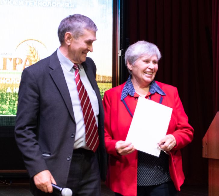 Следующим спикером была Зинаида Михайловна Колотилина, Заслуженный агроном России, консультант АО Фирмы «Август». Она выступила с докладом на тему: «Решение актуальных проблем защиты сои от вредных объектов при выращивании по интенсивной технологии». Зинаида Михайловна в начале своего выступления обратила внимание участников на то, что соя является перспективной и экономически выгодной культурой. Спикер рассказала об особенностях выращивания сои, об условиях выращивания, о севообороте, призвала к использованию адаптированных сортов к конкретным почвенно-климатическим условиям. Зинаида Михайловна подробно рассказала схемы защиты сои от вредителей, болезней и сорняков, рассказала о новинках в линейке продуктов производства АО «Август». Подробно рассказала, как действует каждый препарат, как и в каких условиях его нужно использовать. Особое внимание уделила протравливанию семян сои, а также процессу инокуляции сои. Доклад Зинаиды Михайловны вызвал у аудитории множество вопросов.